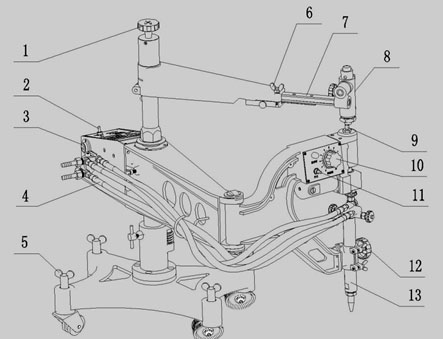 4.輸送氣體的軟管:安裝在分配器與割炬之間,共四根。分為預熱氧、切割氧、燃氣和壓力開關供氣。 |