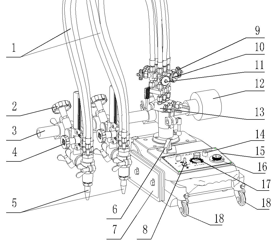 3.橫移齒條 4.割炬垂直調節手輪 5.割嘴