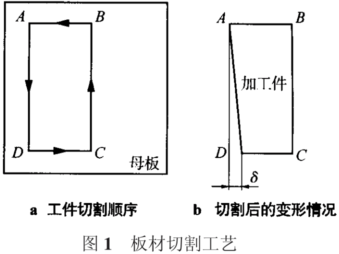在數控等離子切割過程中選擇合理的切割工藝,所產生的變形量也不同。如在切割圖 l 所示的板材時,若選擇 A 點為起弧點,切割方向和順序為A!D!C!B!A,如圖 la 所示。當完成 AD 段的切割,加工 DC 段時,由于 DC 段余料窄,切割時高溫使 DC 段余料產生線性伸長,CB 段向外偏轉,切割后使 DC 段尺寸縮小 ! ,如圖 lb 所示, ! 的大小與DC 段的尺寸成正比。如果選擇 A!B!C!D!A 的切割順序,工件最后經 DA 與母板分離,可有效減小切割變形。