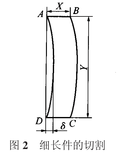 對于如圖 2 所示細長件的切割,若按 A!B!C!D!A,當切割 DA 段時,BC 段的膨脹可阻止 CD段的膨脹,完成整體切割冷卻后,DA 段的收縮量要大于 BC 段的收縮量,使工件向 DA 側彎曲。旁彎量! 的大小取決于加工件的長寬比 Y!X,長寬比越大,旁彎量 ! 就越大。
