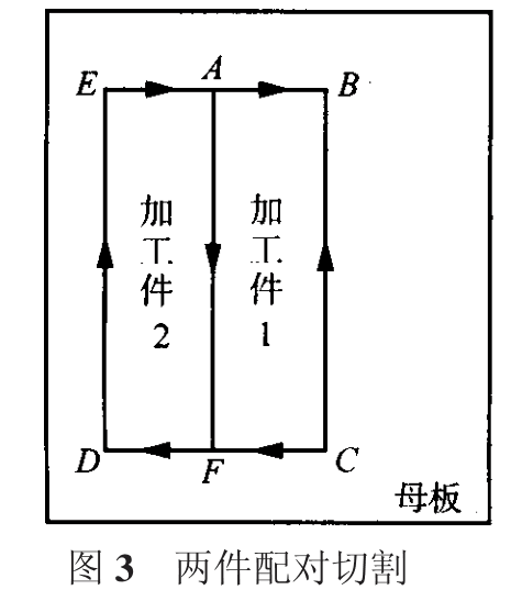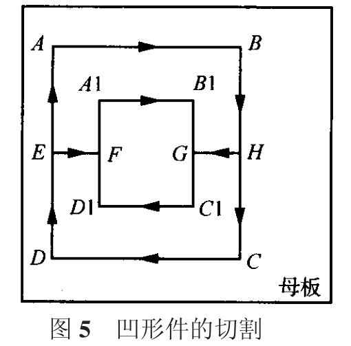 (l)對于凹型件采取兩件配對切割的方法,先切割內邊,后切割外邊,最后由外向內使兩件分開。切割順序如圖 5 所示,內邊:Al!Bl!Cl!Dl!Al;外邊:A!B!C!D!A;切斷:E!F,H!G。