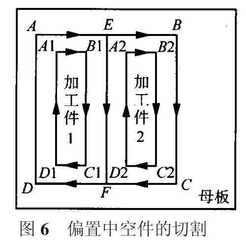 (2)對于偏置中空件應采取兩件配對切割,最后使兩件分離。切割順序如圖 6 所示,內邊:Al!Bl!Cl!Dl!Al,A2!B2!C2!D2!A2;外邊:A!B!C!D!A;最后 E!F。