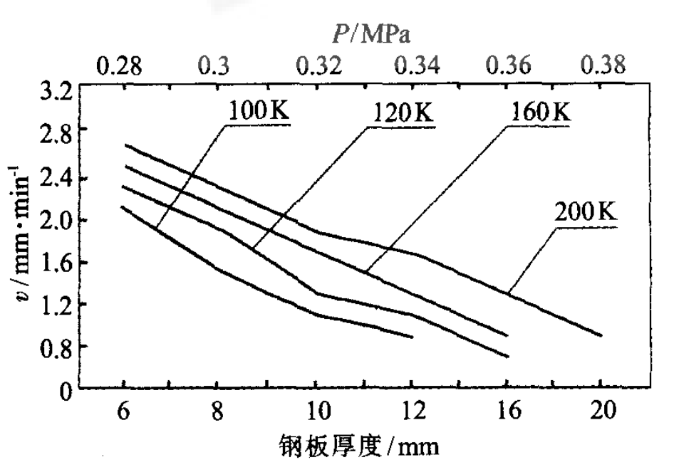 從表1結(jié)果可看出,當切割速度過高、氣壓過低時,切割面的傾斜度大。這是因為速度過快,弧柱嚴重后傾,割縫下半部熔化速度跟不上。所以切割的零件上平面尺寸小。下平面尺寸大,尤其是切割直角形的零件時.在拐角處的底部割縫成圓弧形而不是直角形。如果切割速度過低、氣壓過高則掛渣嚴重,不易清除,光潔度較差。如果切割速度合適,工作氣壓過高,弧柱的挺度和圓滑度受到破壞,切割能力下降.切割光潔度差。所以,切割不同厚度的鋼板,需要合理地選擇不同的切割功率、切割速度和工作氣壓,才能得到最佳的切割效果。從表1數(shù)據(jù)還可看出,不同的鋼板厚度有不同的最佳切割速度和工作氣壓。我們根據(jù)四種不同型號機型的試驗數(shù)據(jù)進行分析和整理,繪制出了用不同功率的等離子切割機切割不同厚度鋼板的最佳切割速度與工作氣壓參數(shù)曲線圖,如圖1所示。